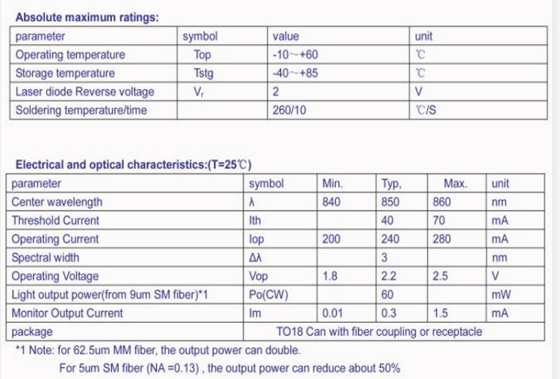 Multi-mode fiber output power: 120mW Threshold current: 25mA