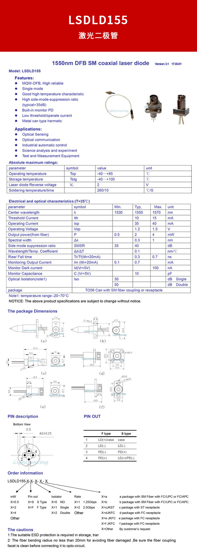 LSDLD155 1550nm Optical fiber output 3mW DFB Cavity laser diode